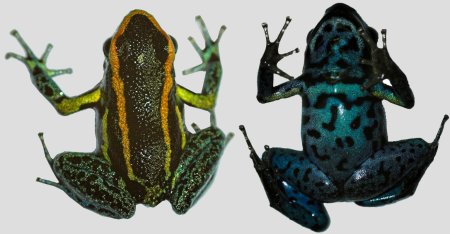 ![]() Abb.: (5)Dorsal- und Ventralansicht von Hyloxalus azureiventris © 2008 Thomas Ostrowski (0) | Größe vergleichen: Dorsal- und Ventralbild vergleichen: |