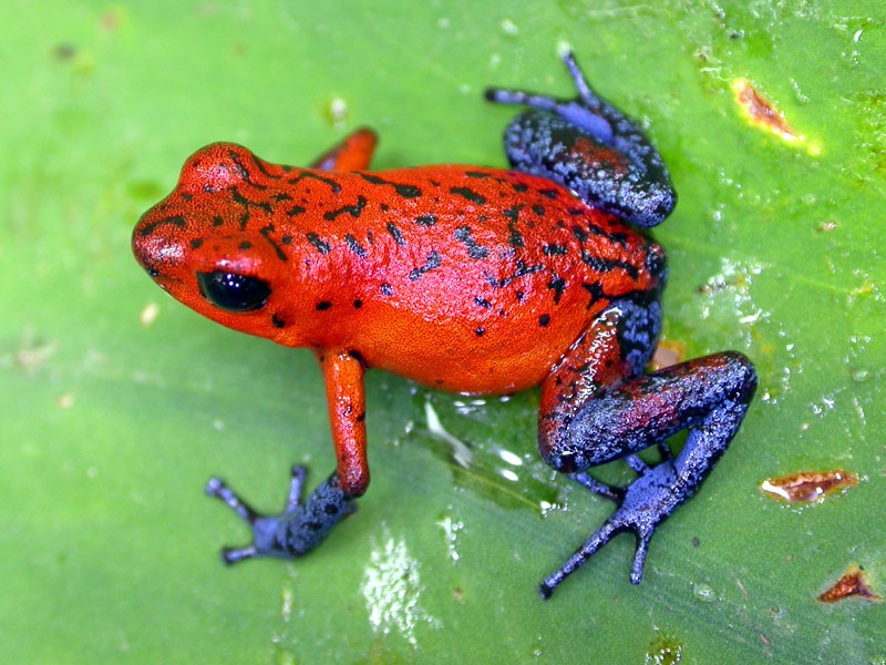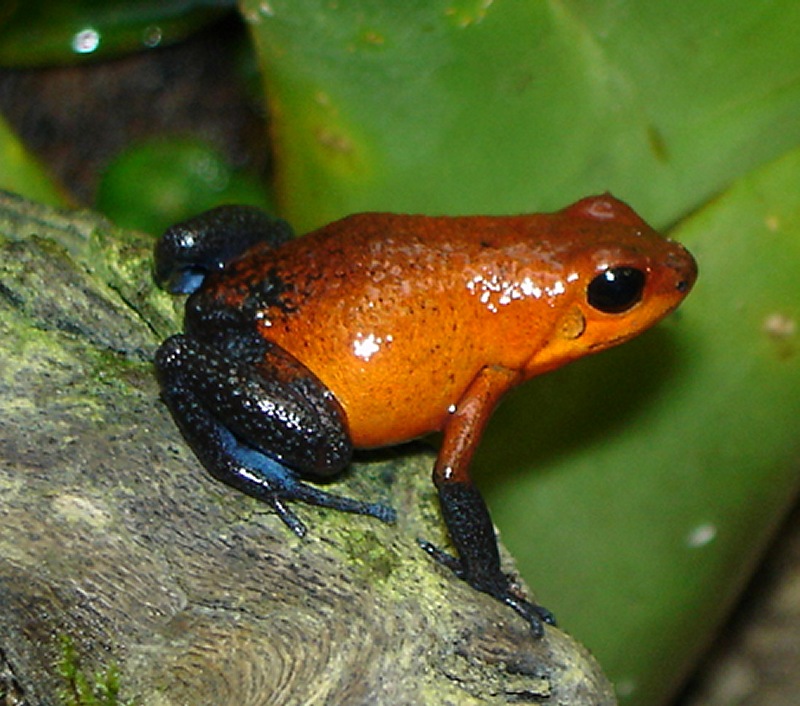 Abb.: Häutung von Oophaga cf. typographa. Wie alle Anuren häuten sich auch Dendrobatidae in regelmäßigen Abständen. Die Haut wird anschließend verzehrt.