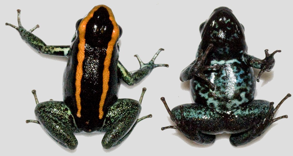 ![]() Abb.: ()Dorsal- und Ventralansicht von Phyllobates vittatus © 2008 () | Dorsal- und Ventralbild vergleichen: |